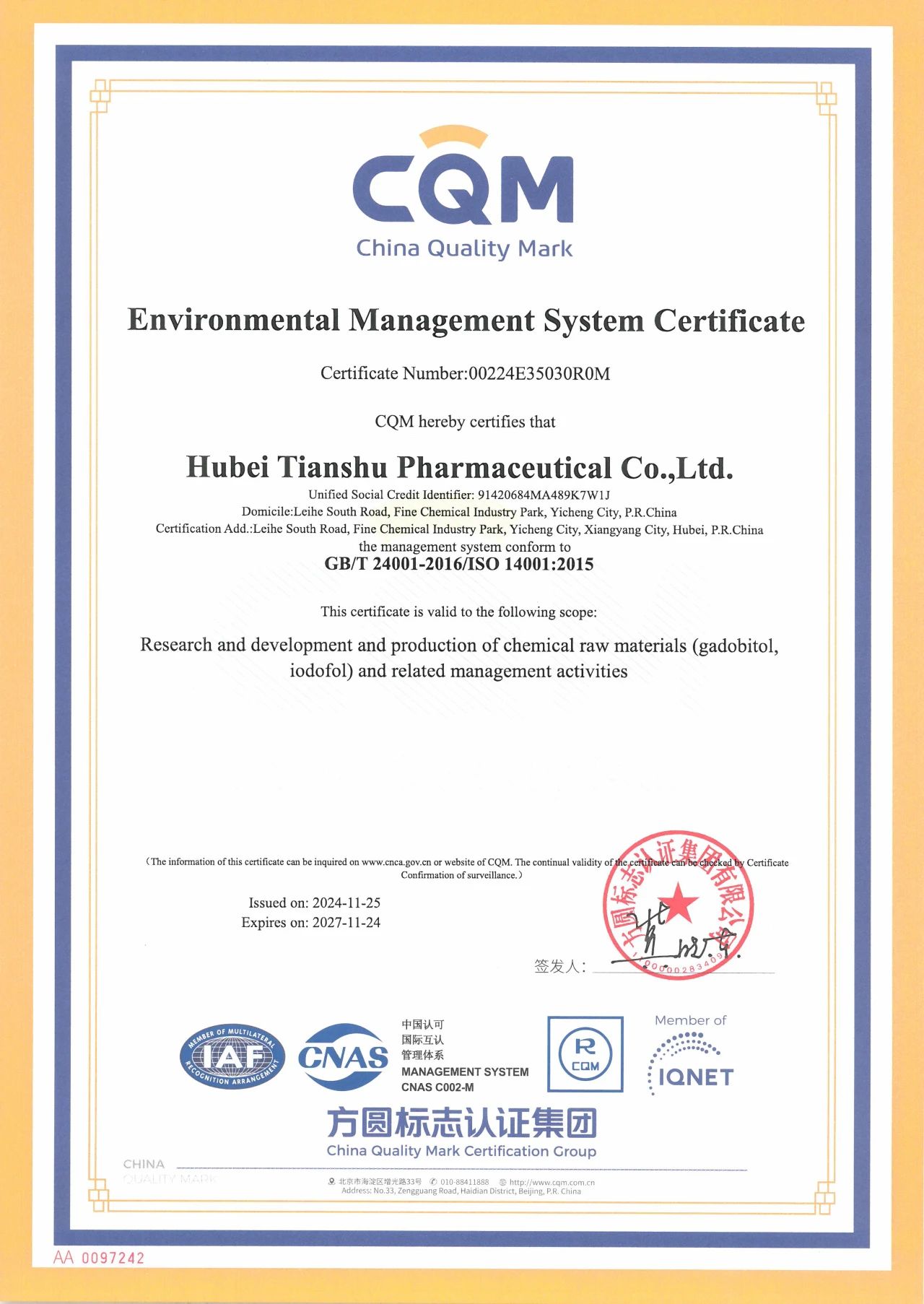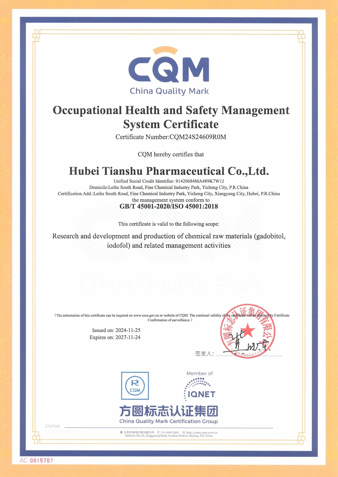近日,湖北天舒药业有限公司(简称“天舒药业”)顺利通过GB/T19001-2016/ISO质量管理体系、GB/T24001-2016/ISO环境管理体系和GB/T45001-2020/ISO职业健康安全管理体系“三标一体化”认证并获认证机构方圆标志认证集团(简称“方圆认证”)颁发的证书,标志着天舒药业管理体系获得了专业机构的认可。
