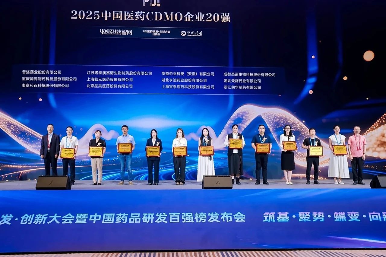 6月20日,“2025 PDI 医药研发·创新大会暨中国药品研发百强榜发布会”隆重揭晓了“2025中国药品研发实力排行榜系列榜单”,湖北天舒药业有限公司(简称“天舒药业”)荣登“中国医药CDMO企业20强”榜单。