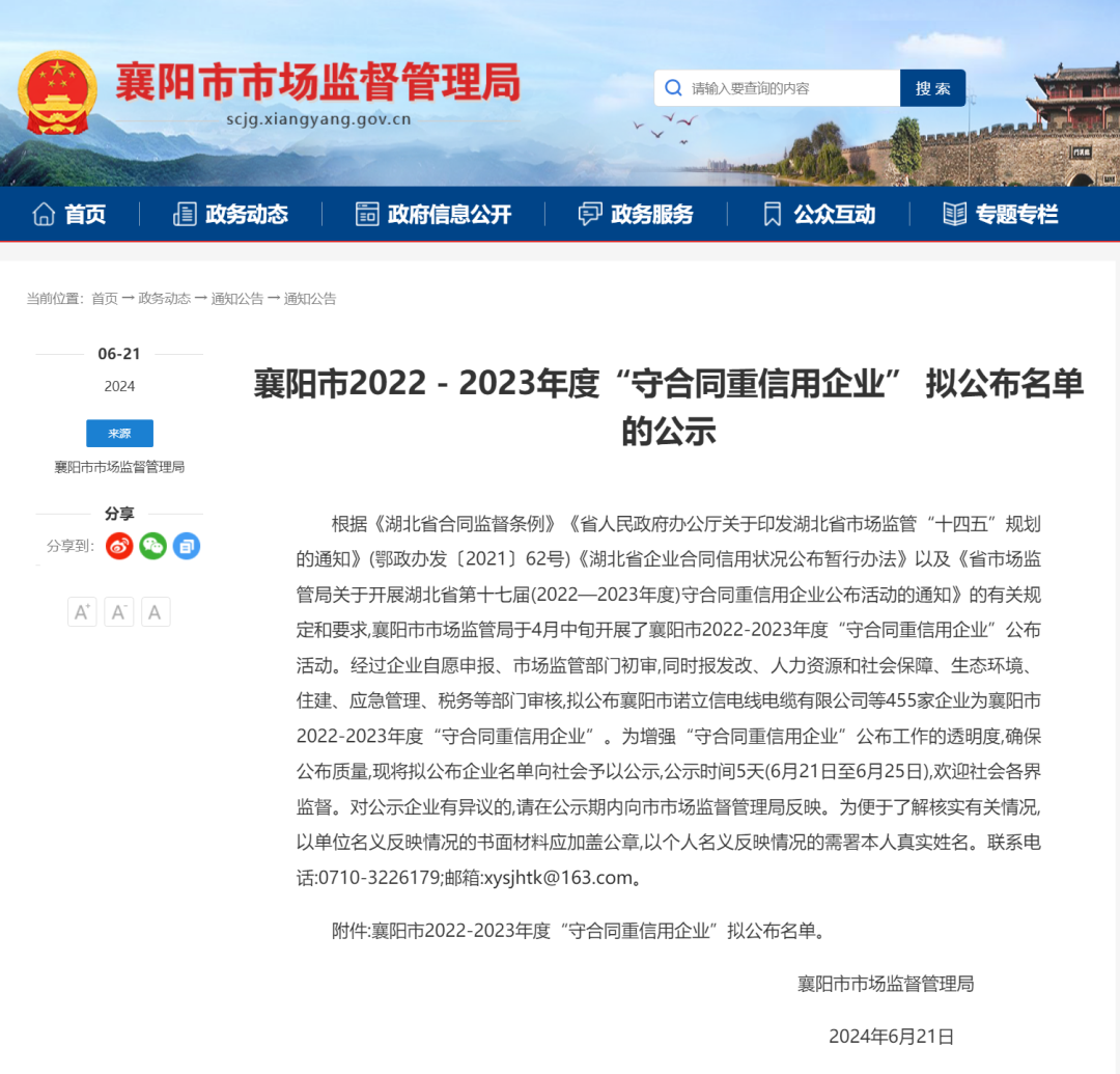 2024年6月21日,襄阳市市场监督管理局对“襄阳市2022-2023年度‘守合同重信用企业’” 名单进行公示,湖北天舒药业有限公司(简称“天舒药业”)凭借良好的社会信用和规范的合同管理体系,成功获评该称号。