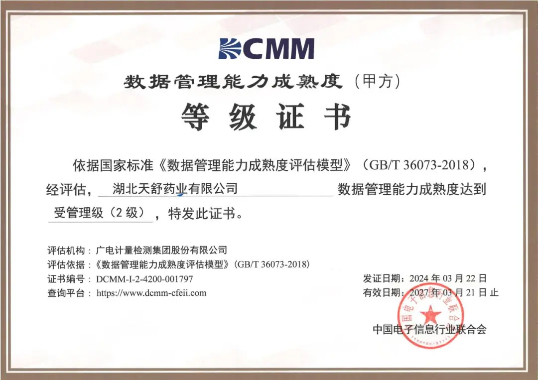 近日,中国电子信息行业联合会公布了2024年第一批获得DCMM数据管理能力成熟度等级证书的单位名单,湖北天舒药业有限公司(简称“天舒药业”)获评DCMM甲方受管理级(二级)认证,标志着天舒药业数据管理能力已达到国家标准,也代表着天舒药业在数据管理和运营执行方面具备极强的竞争性和代表性。